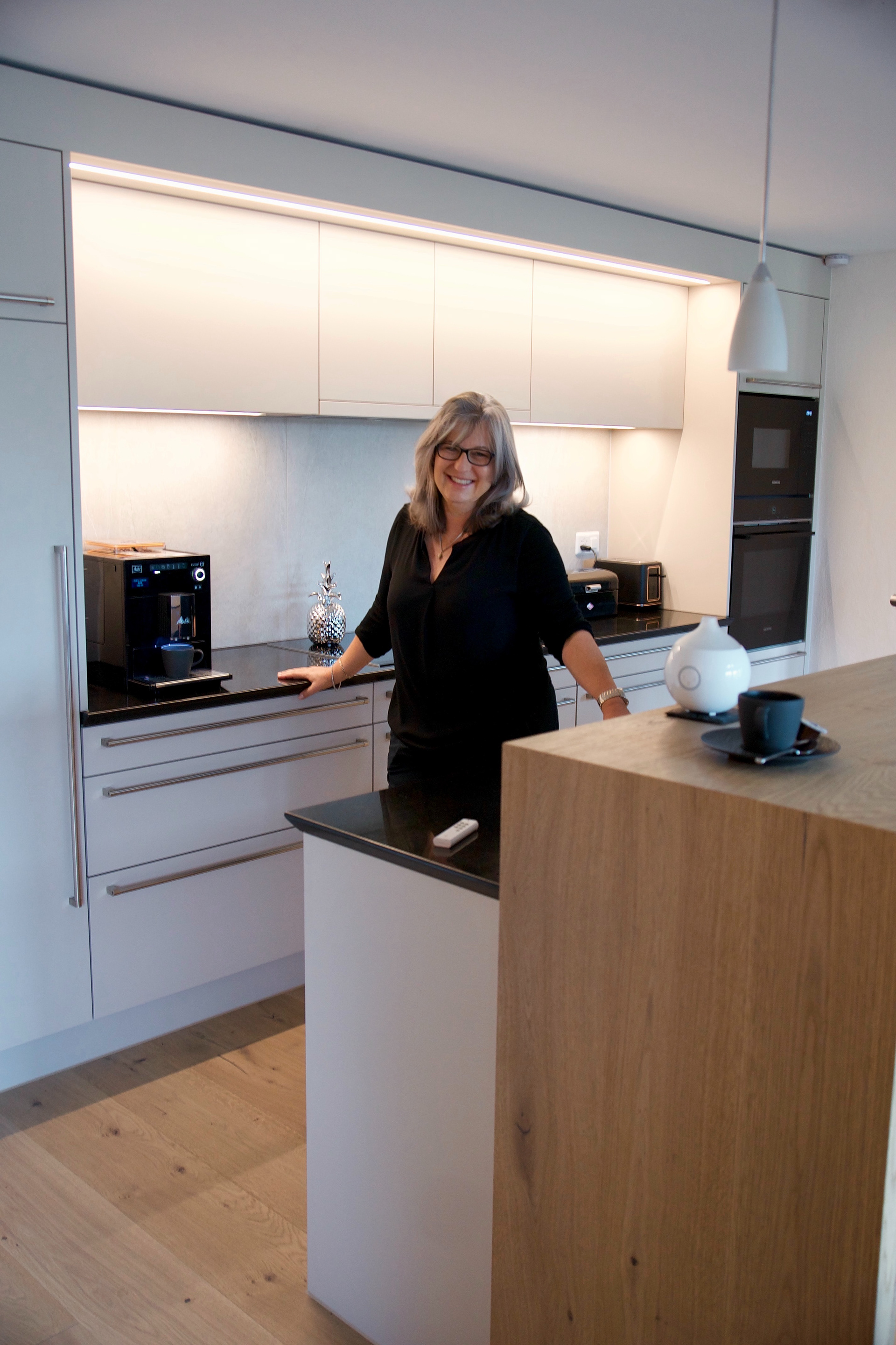 So entstand eine schlichte, elegante Holzbar, die als verbindendes Element zwischen Küche und Wohnraum fungiert und gleichzeitig Wärme und Natürlichkeit ausstrahlt. Neue Schrankfronten, moderne Geräte wie Backofen und Steamer sowie eine dezente, stimmungsvolle Beleuchtung runden das neue Küchenkonzept ab.